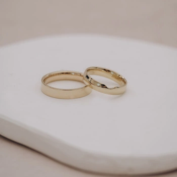 Najłatwiej przymierzyć różne warianty na dłoni. Cieńsze obrączki wyglądają delikatnie i subtelnie, szersze są wyraziste i bardziej „biżuteryjne”. Profil soczewkowy sprawia, że obrączka lepiej układa się na palcu – właśnie tego używamy w Złotej Linii.