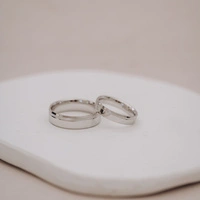 Rodowanie to pokrycie białego złota cienką warstwą rodu, żeby nadać mu jasny, chłodny odcień. Z czasem rod może się delikatnie ścierać — zwłaszcza na obrączkach noszonych codziennie. W Złotej Linii wykonujemy odświeżenie rodowania, gdy pojawi się taka potrzeba.