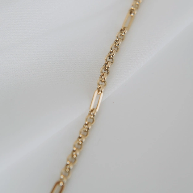 Bransoletka ogniwkowa to kwintesencja ponadczasowej elegancji i delikatnego stylu. Jej misterny splot łączy drobne, okrągłe ogniwa z wydłużonymi elementami, tworząc harmonijną kompozycję pełną lekkości. Wykonana z najwyższej jakości złota próby 585, doskonale podkreśla kobiecość i subtelny blask każdej stylizacji.