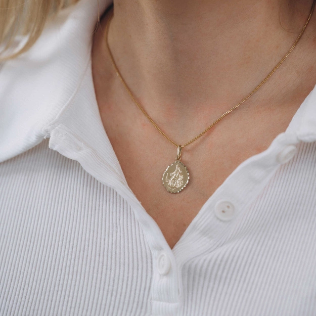 Klasyczna, dwustronna zawieszka Szkaplerz wykonana z wysokiej próby złota 585. Z jednej strony przedstawia wizerunek Matki Boskiej z Dzieciątkiem, symbol czułości, opieki i duchowego przewodnictwa. Na odwrocie widnieje postać Jezusa Chrystusa – symbol miłości, ofiary i zbawienia. Obie strony wykończone zostały z niezwykłą precyzją, z subtelnym efektem matowania, który podkreśla detale i nadaje zawieszce elegancki charakter.