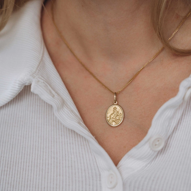 Klasyczna, dwustronna zawieszka Szkaplerz wykonana z wysokiej próby złota 585. Z jednej strony przedstawia wizerunek Matki Boskiej z Dzieciątkiem, symbol czułości, opieki i duchowego przewodnictwa. Na odwrocie widnieje postać Jezusa Chrystusa – symbol miłości, ofiary i zbawienia. Obie strony wykończone zostały z niezwykłą precyzją, z subtelnym efektem matowania, który podkreśla detale i nadaje zawieszce elegancki charakter.