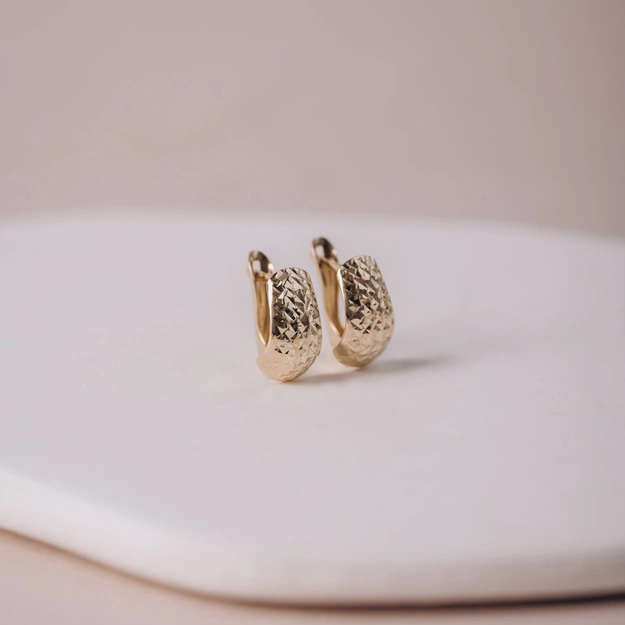 Złote Klasyczne „Luna Shine” to połączenie subtelności i ponadczasowej elegancji. Kolczyki zostały wykonane w formie delikatnych, zaokrąglonych huggies, które dzięki swojemu kształtowi idealnie przylegają do ucha, tworząc niezwykle estetyczny, harmonijny efekt. Powierzchnia kolczyków zdobiona jest elegancką fakturą, która dodaje im wyjątkowego charakteru i pięknie odbija światło.