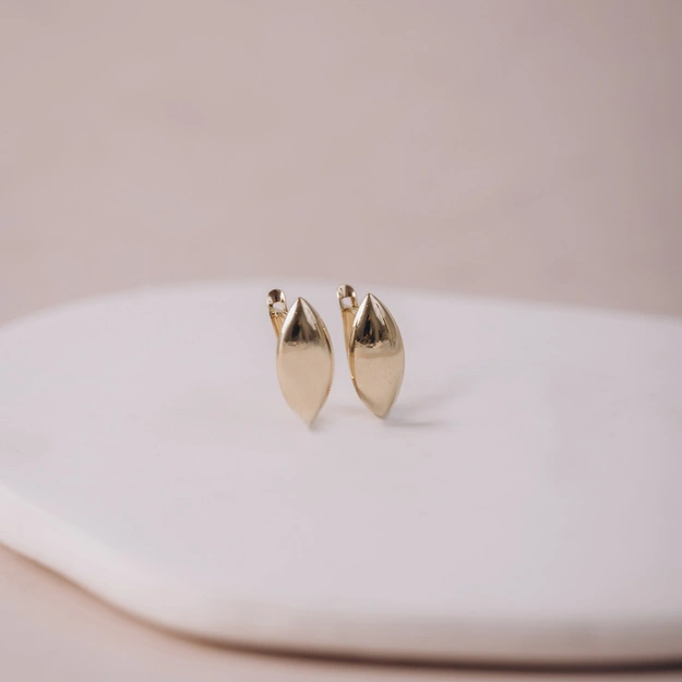 - Złote kolczyki 585 w kształcie diamentowanych migdałków na angielskim zapięciu. Mocno błyszczące, wygodne i bezpieczne — idealne na co dzień i na eleganckie wyjścia.