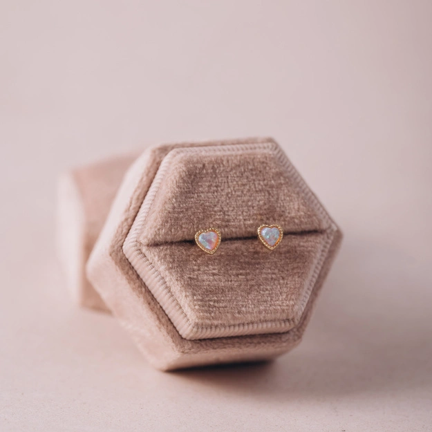 - Złote kolczyki 585 z niebieskim opalem w kształcie serduszka. Małe, wygodne i przylegające do ucha — idealne do codziennego noszenia oraz dla mam ceniących praktyczną i efektowną biżuterię.