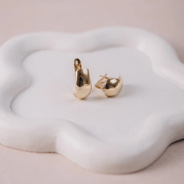 Eleganckie kolczyki ze złota próby 585 o miękkiej, opływowej formie, która subtelnie przypomina delikatną, złotą kroplę. Są niezwykle lekkie, gładkie i komfortowe w noszeniu, dzięki czemu sprawdzą się idealnie na co dzień.