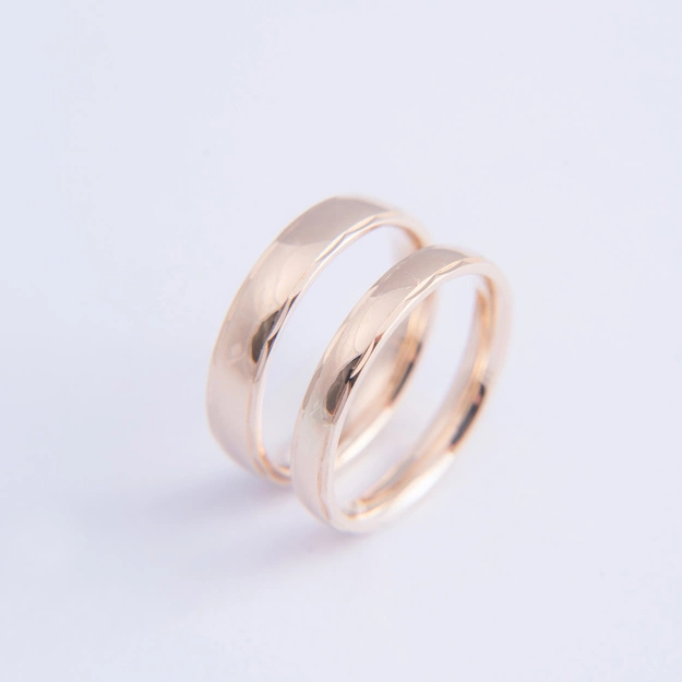 Delikatnie zaokrąglony profil oraz starannie wypolerowana powierzchnia nadają obrączkom miękki, naturalny blask. Ich subtelna linia sprawia, że są niezwykle wygodne w codziennym noszeniu, zachowując jednocześnie elegancki, ponadczasowy charakter. Na brzegach mieniące się wykończenie, cięte nożem zakończonym diamentem.