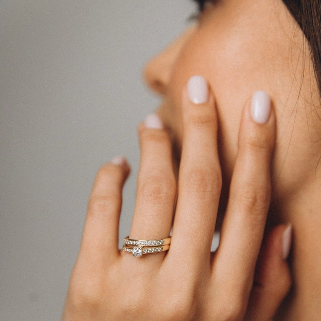 Delikatna, precyzyjnie wyprofilowana obrączka stanowi elegancką bazę dla centralnych elementów – lśniących brylantów. Idealnie nadaje się jako pierścionek zaręczynowy lub wyjątkowy prezent dla bliskiej osoby. Model ten posiada również wielką zaletę, polegającą na idealnym spasowaniu z obrączką.