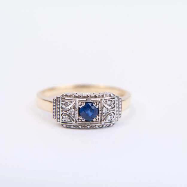 - Złoty pierścionek w stylu vintage z centralnym szafirem i ozdobną oprawą z brylantami. Elegancki, kunsztownie wykonany model o ponadczasowym charakterze, idealny na prezent lub wyjątkową okazję. Próba złota 585.