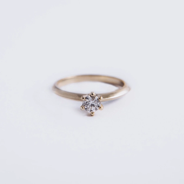 - Klasyczny pierścionek z brylantem 0,20 ct w pięknym kolorze G, wykonany ręcznie w tradycyjnej pracowni złotniczej. Dynamicznie uformowana szyna dodaje mu lekkości i nowoczesnej elegancji. W cenie pierścionka znajduje się również stylowe opakowanie.