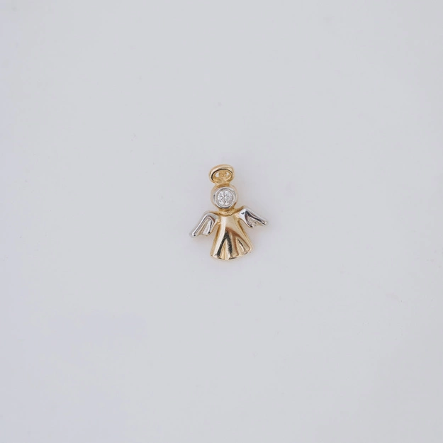 - Zawieszka wykonana z wysokiej próby złota 585. Delikatna zawieszka w kształcie aniołka z białymi skrzydełkami i cyrkonią.
