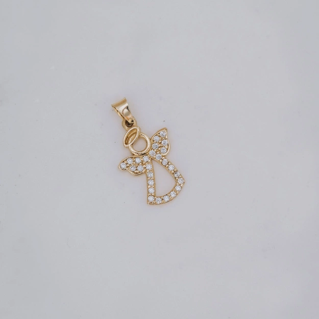 - Zawieszka wykonana z wysokiej próby złota 585. Delikatna zawieszka w kształcie aniołka z białymi cyrkoniami.