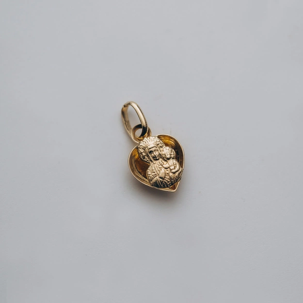 Elegancka zawieszka w kształcie serca wykonana z wysokiej jakości złota próby 585. Na froncie precyzyjnie odwzorowany wizerunek Matki Bożej Częstochowskiej z Dzieciątkiem, symbolizujący opiekę, miłość i duchową ochronę. Detale rzeźbienia podkreślają kunszt jubilerski i nadają zawieszce wyjątkowy charakter. Z drugiej zaś strony jest to gładkie serduszko które możemy nosić zamiennie.