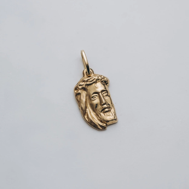 Wyjątkowa zawieszka w formie wizerunku twarzy Chrystusa, wykonana z wysokiej jakości złota próby 585 (14K). Rzeźbiona w precyzyjny sposób twarz Zbawiciela z wyrazistymi rysami i pełnym skupienia spojrzeniem emanuje siłą duchowego przekazu oraz elegancją klasycznego wzornictwa.
