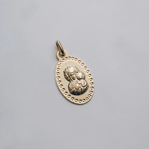 - Złota zawieszka z wizerunkiem Matki Bożej – owalna, próba 585