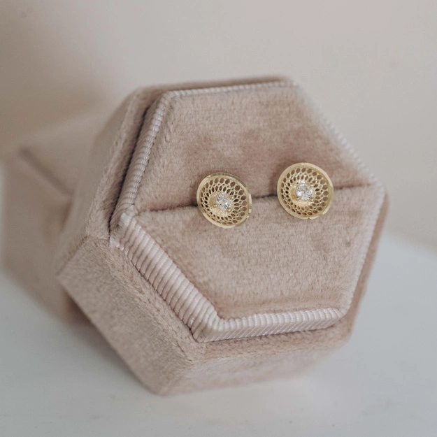 Eleganckie kolczyki wykonane z najwyższej jakości złota próby 585 (14K), zachwycające swoim subtelnym i zarazem wyrafinowanym wzornictwem. Okrągły kształt z delikatnym koronkowym wykończeniem pięknie komponuje się z centralnie osadzoną, błyszczącą cyrkonią, która nadaje całości wyjątkowego blasku i kobiecego uroku.
