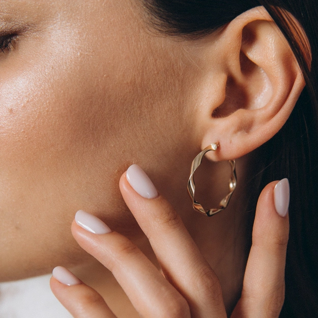 Kolczyki koła z żółtego złota próby 585 o subtelnym kształcie przypominającym skręconą wstążkę. Model ten jest niezwykle wdzięczny i kobiecy. Wymiar przedstawiony na zdjęciu prezentuje kolczyk o proporcjach które pięknie prezentują się przy dłuższych włosach jak i krótkich fryzurach. Koła to obecnie podstawa biżuteryjnej szkatułki, świetne na co dzień jak i na specjalne okazje do prostej sukienki.