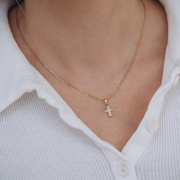 Subtelny i elegancki krzyżyk wykonany z najwyższej jakości złota próby 585 (14K). Jego klasyczna forma została ozdobiona lśniącymi cyrkoniami, które pięknie odbijają światło, nadając zawieszce wyjątkowego blasku.