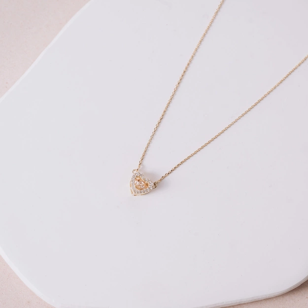 - Złoty naszyjnik 585 w kształcie serca, wysadzany cyrkoniami. W środku znajduje się ruchoma cyrkonia, która migoce przy każdym ruchu, dodając biżuterii niezwykłego blasku.