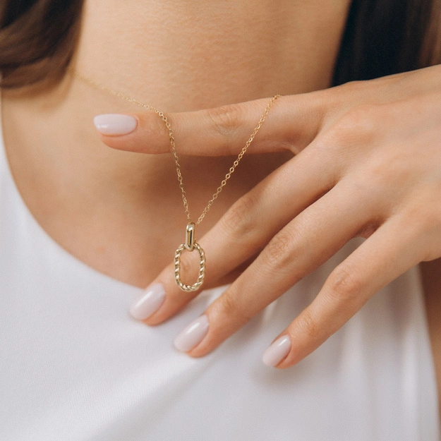 Naszyjnik wykonany ze złota próby 585 zachwyca subtelną elegancją i ponadczasowym stylem. Delikatny łańcuszek został połączony z owalną zawieszką o plecionym wykończeniu, które dodaje całości wyjątkowego charakteru i lekko trójwymiarowego efektu. Biżuteria pięknie odbija światło, podkreślając szyję i dodając kobiecego uroku zarówno w codziennych stylizacjach, jak i podczas wyjątkowych okazji.