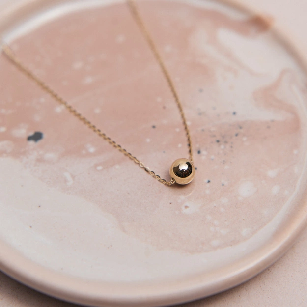 - Delikatny naszyjnik ze złota próby 585 z minimalistyczną, gładko polerowaną kulką, która subtelnie odbija światło. Elegancki i ponadczasowy, doskonale uzupełni zarówno codzienne, jak i bardziej eleganckie stylizacje.