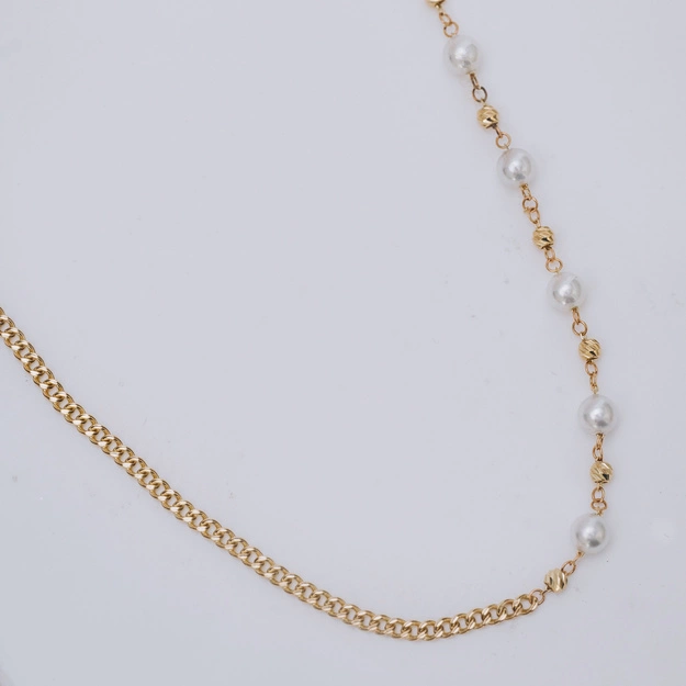Wyjątkowy naszyjnik wykonany z żółtego złota próby 585, który łączy klasyczną elegancję z nowoczesnym designem. Część łańcuszka stanowi klasyczny splot, podczas gdy druga część zdobiona jest naprzemiennie ułożonymi białymi perłami i złotymi kuleczkami. Ten subtelny kontrast struktur i materiałów tworzy unikatową kompozycję, która doskonale podkreśli Twój styl i doda stylizacji kobiecego uroku.