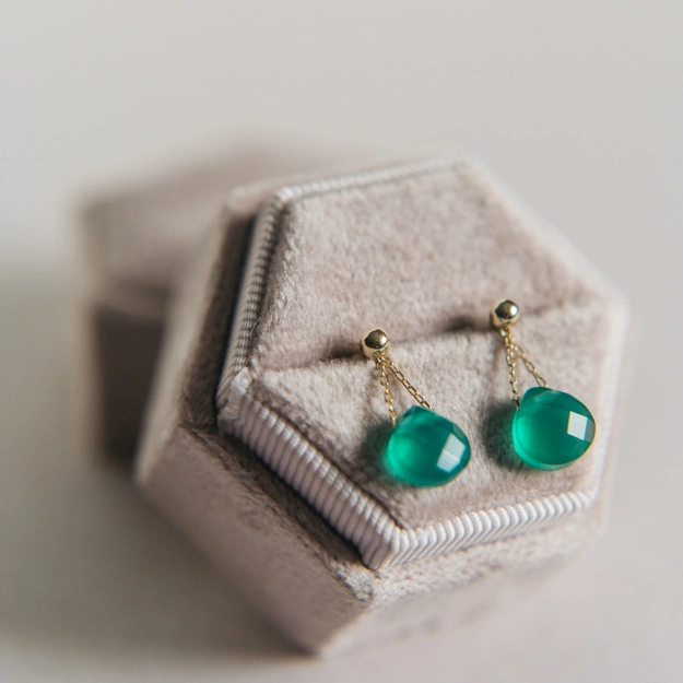 Gładko oszlifowane krople chalcedonu w hipnotyzującym odcieniu morsko-zielonym zawieszone są na finezyjnych, złotych łańcuszkach, które poruszają się lekko przy każdym ruchu. Minimalistyczne wykończenie w postaci klasycznych sztyftów z kuleczkami sprawia, że całość prezentuje się lekko, nowocześnie i bardzo kobieco.
